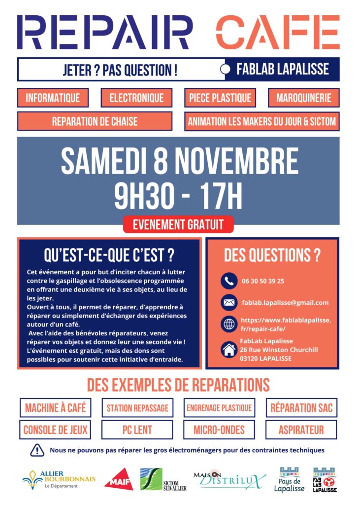 Nous organisons deux fois dans l’année (une fois en Printemps et une fois en Automne) un Repair Café en collaboration avec le SICTOM Sud-Allier, MAIF et Distrilux.