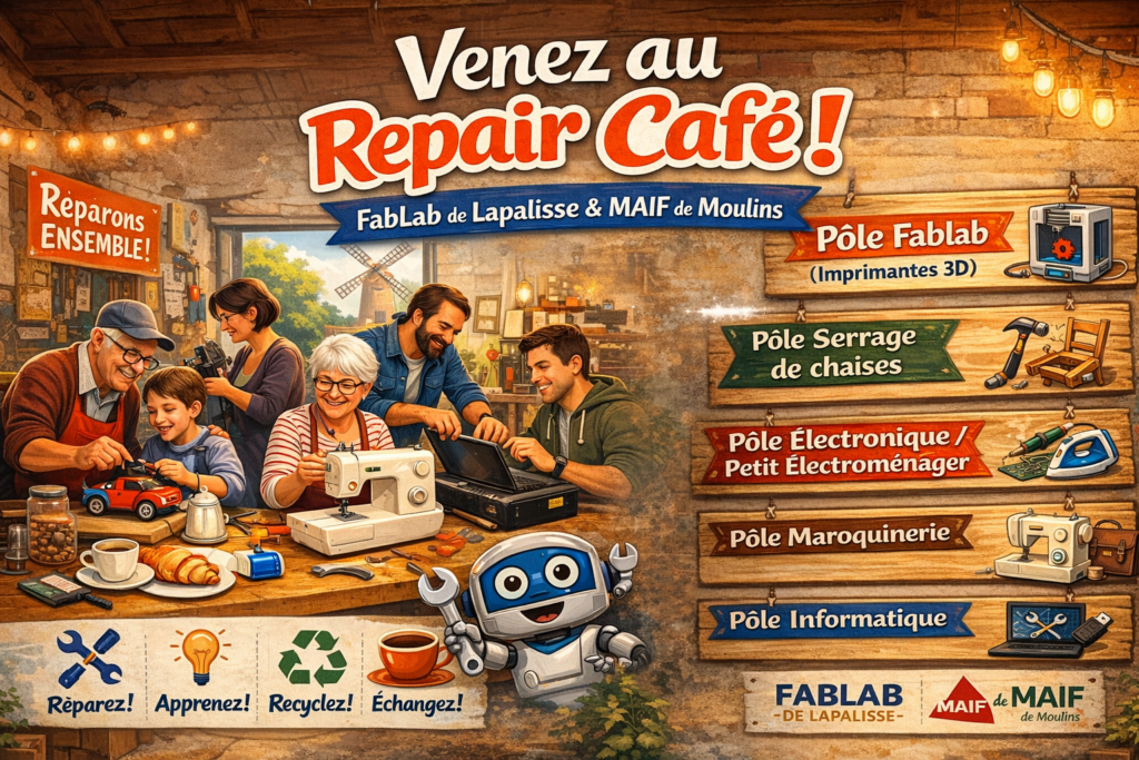Prochaine édition du Repair Café le 28 Mars 2026 à MOULINS (à la MAIF) et le suivant le 27 Juin 2026 à LAPALISSE.